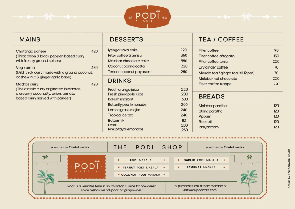 The term podi is from Tamil and Telugu, which means “powder” literally. In the culinary world, it refers to aromatic spice powders made with roasted lentils, spices, and, at times, herbs. These powders are usually mixed with ghee or sesame oil and enjoyed with idlis, dosas, or rice. In South India, every home has its version of podi, which makes it a symbol of comfort, homeliness, and tradition. By naming itself The Podi Café, the establishment is tying into that sense of nostalgia and authenticity.