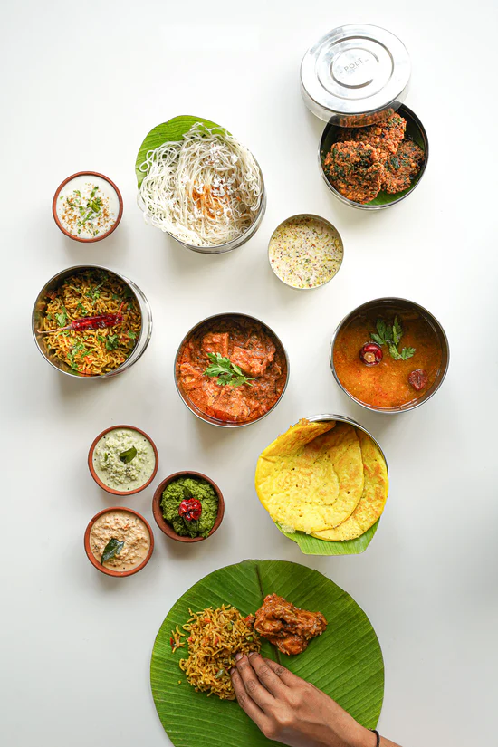 Tiffin menus that include traditional home-cooked lunch items like rice, sambar, rasam, and vegetable curries.